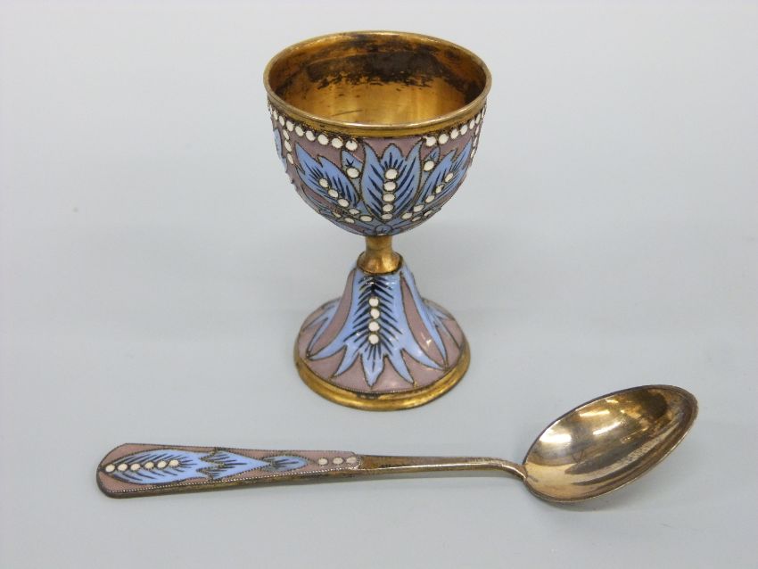 A silver gilt and enamelled egg cup and spoon with impressed 916 and worker's head mark
