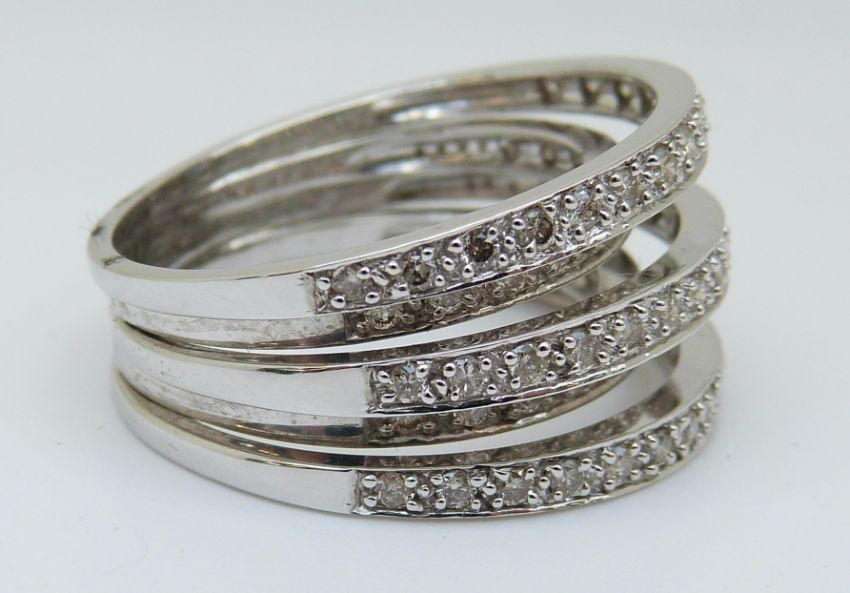 A 9ct white gold ring set with diamonds in layered bands, total diamond weight approximately 1ct, 7.39g (size P)