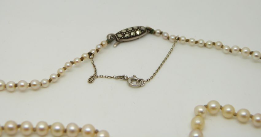 A single strand pearl necklace with a silver and marcasite clasp