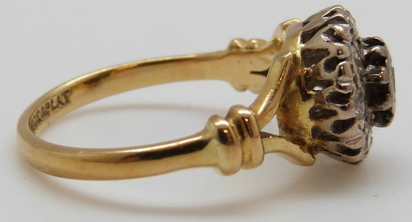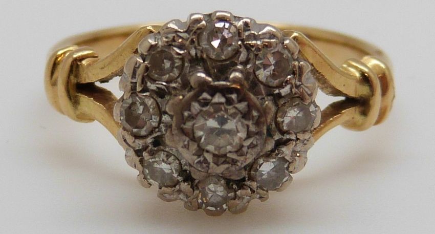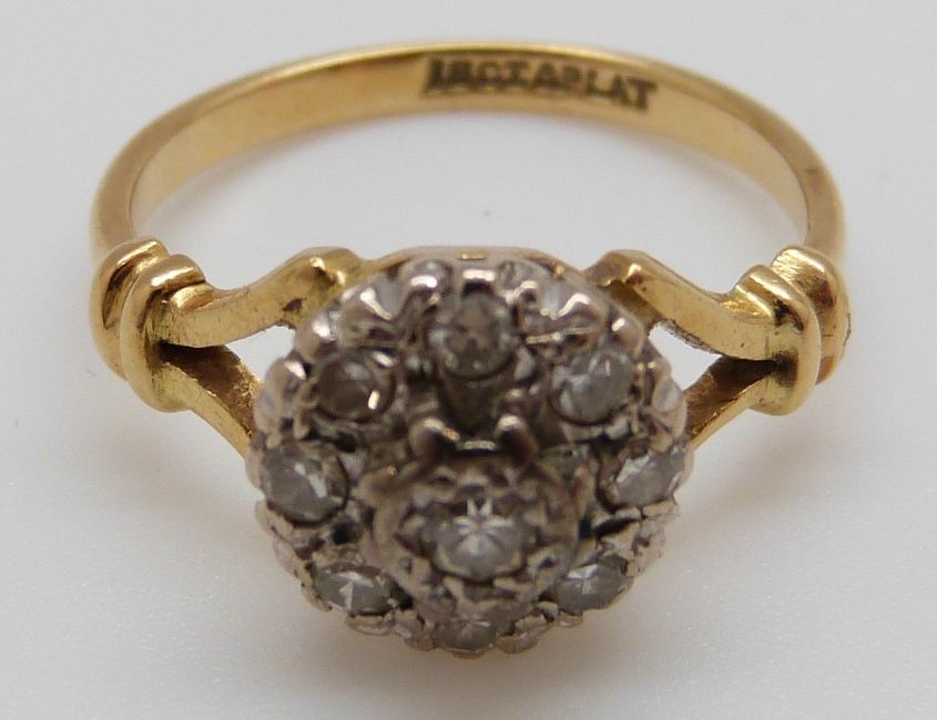 An 18ct gold ring set with diamonds in a cluster, 4g (size M)