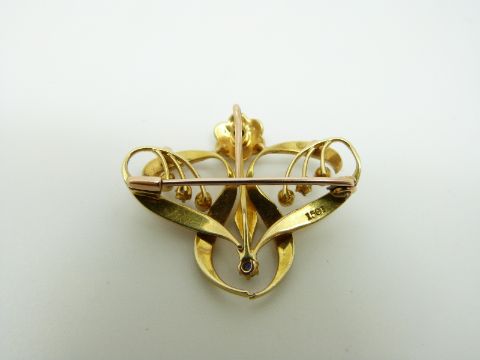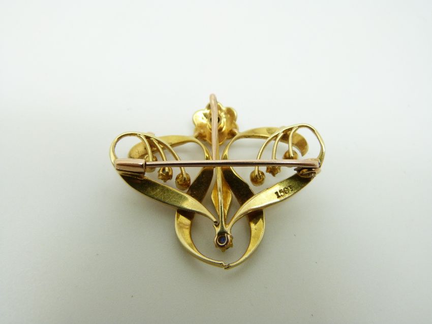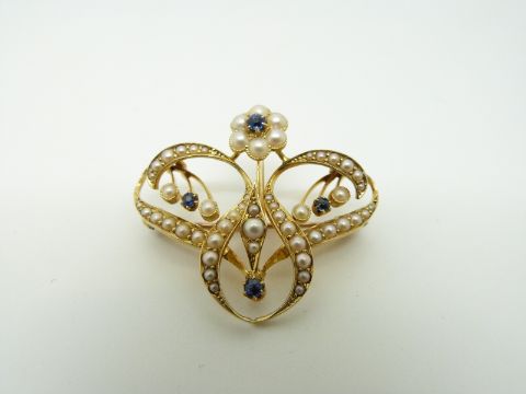 An Art Nouveau 15ct pendant/ brooch set with seed pearls and sapphires, 3.3 x 2.8cm