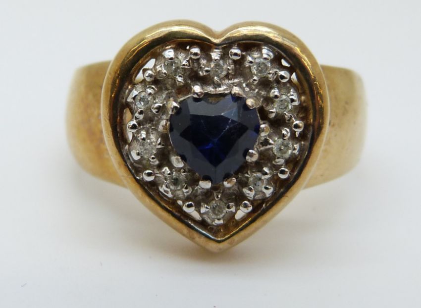 An 9ct gold ring set with a heart shaped sapphire surrounded by diamonds (size M)