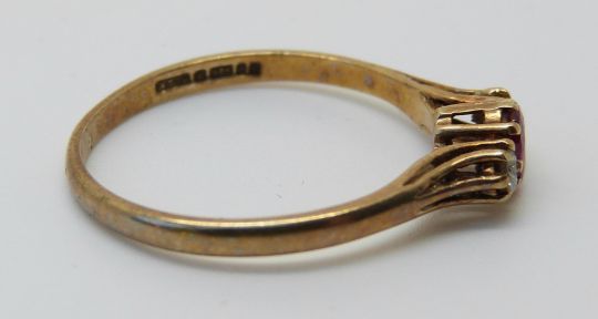 A 9ct gold ring set with an oval cut ruby and two diamonds (size M)