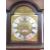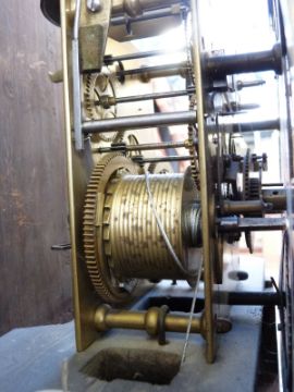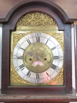 J Wilson Askrigg 19thC oak longcased clock with 8 day duration four pillar movement, the 12 inch Roman brass dial with Arabic minutes on silvered chapter ring with date aperture and engraving with phoenix of hawks, foliate spandrels, the arch with herald naked cherubs. The case with reeded decoration, the scalloped door with brass escutcheon, the flat topped hood with Greek key style carving classical columns with brass capitols, 209cm tall on bracket feet