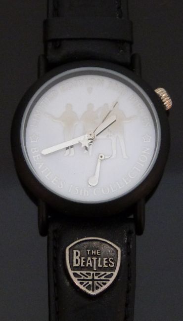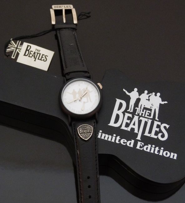 The Beatles gentleman's wristwatch with silver hands and silhouette and white face, on black leather strap, limited edition of 3000, case diameter 33mm, in original box with paperwork and tags.