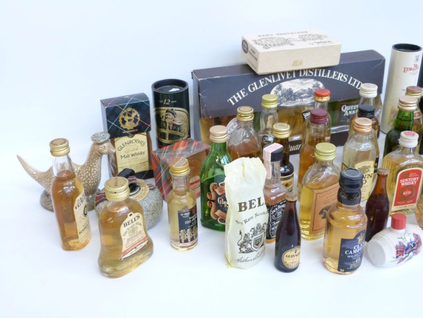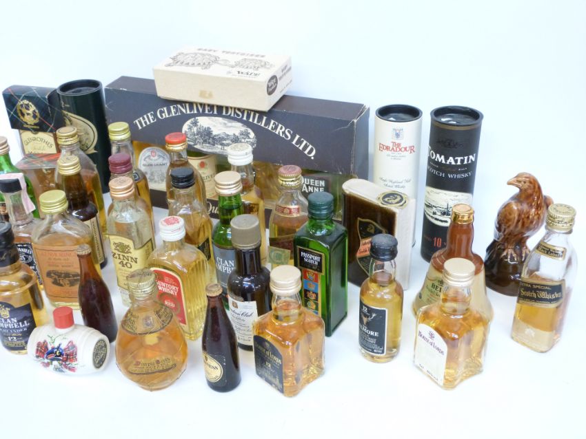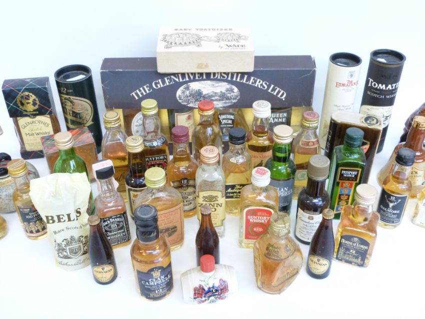 Approximately 40 alcohol miniatures, mainly whisky, including Bunnahabhain 12 year, Tomatin 10 year, Edradour 10 year, Glenmorangie 10 year, Johnnie Walker, Glenlivet gift set