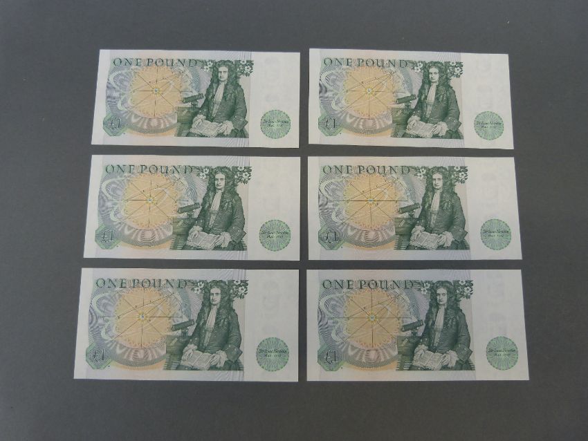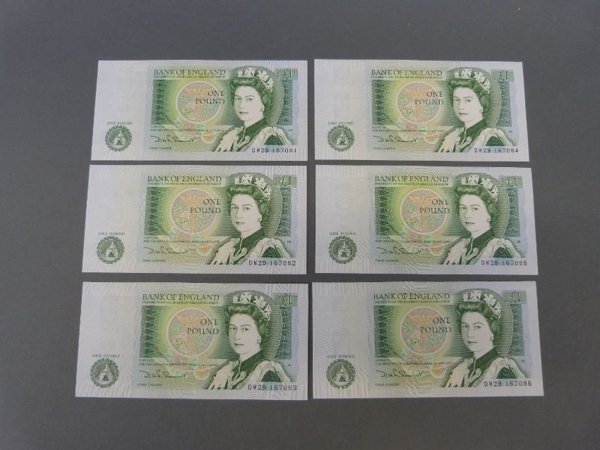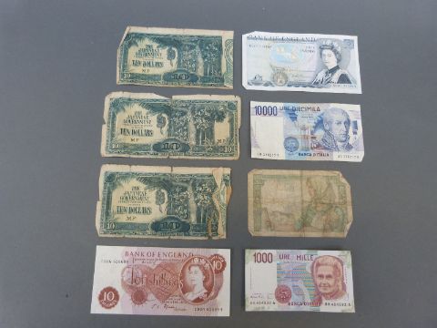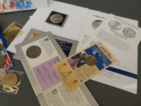 A collection of modern crowns etc, includes a silver VE Day commemorative example, a few stamps etc, and a quantity of UK and overseas banknotes including six consecutive uncirculated Somerset £1 notes