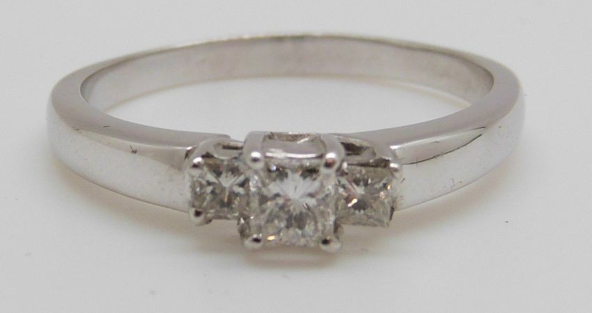 An 18ct gold ring set with three princess cut diamonds totalling approximately 0.31ct (size U)