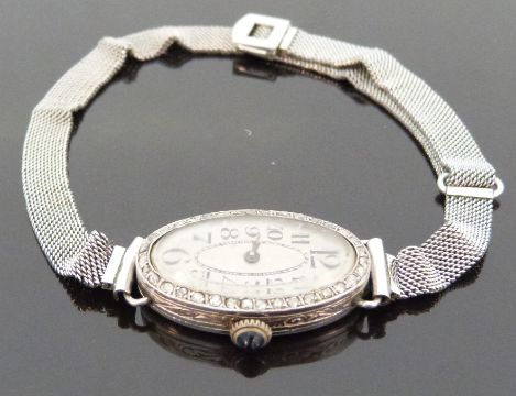 Art Deco Cartier style platinum ladies cocktail wristwatch with Arabic numerals, gold hands and diamond set bezel, on 9ct white gold strap, case size 16x26mm, 18g.