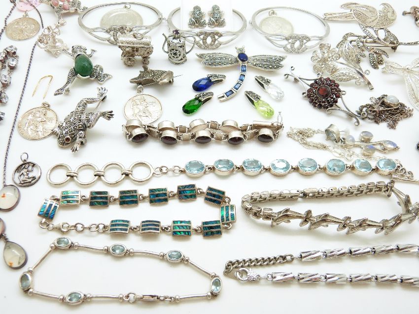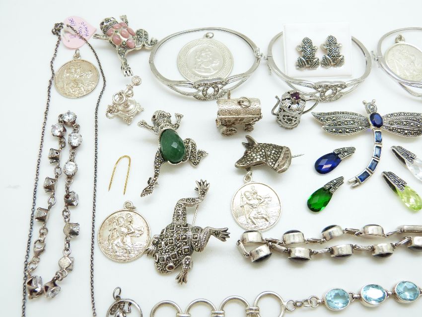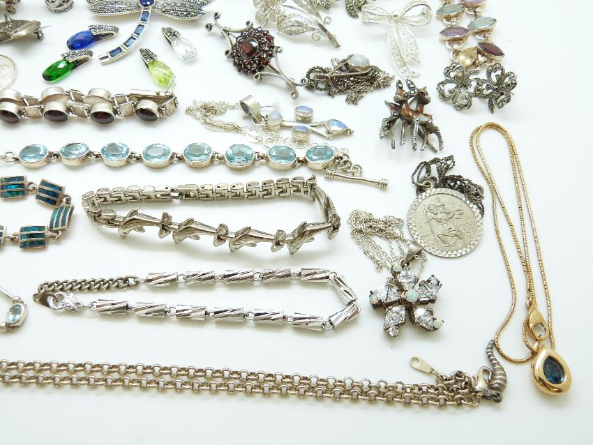 A collection of silver jewellery including a bracelet set with garnets, brooch set with garnets, brooch in the form of a frog set with marcasite, pendant set with moonstone, moss agate necklace, filigree brooch, opal and crystal pendant, silver St Christophers, blue topaz bracelet etc