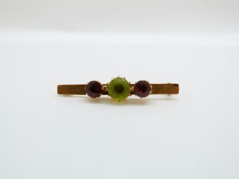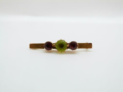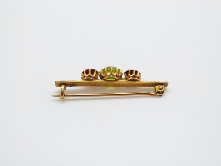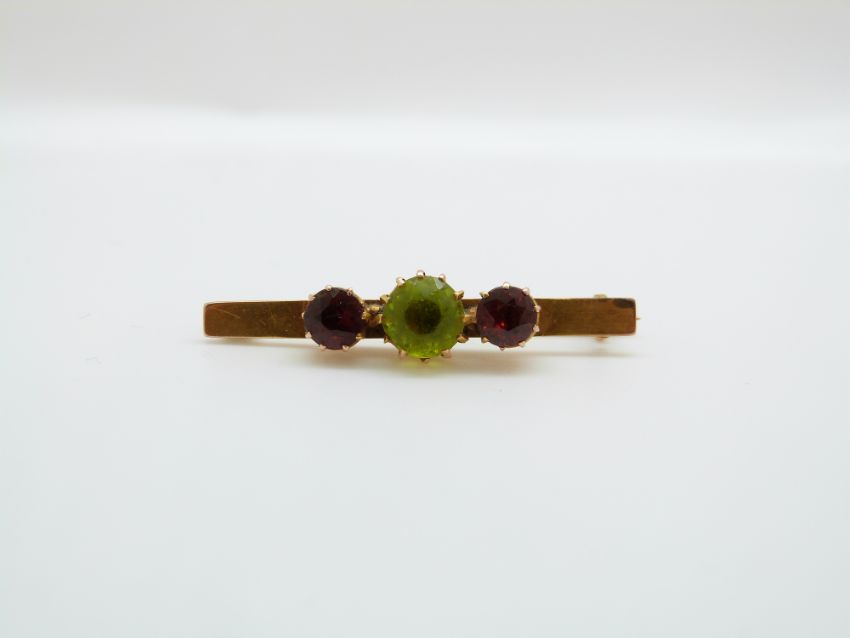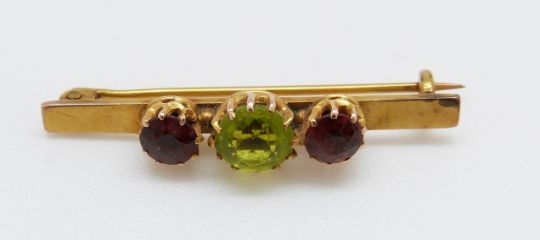 A 15ct gold brooch set with a peridot and two garnets, 3.8cm