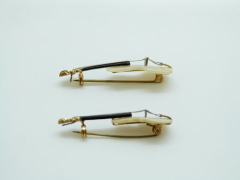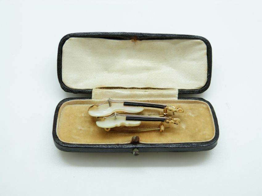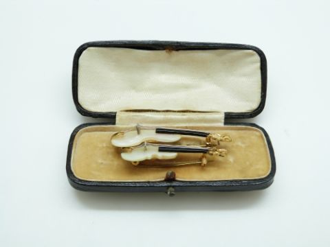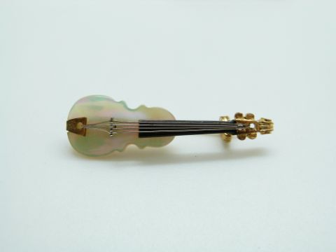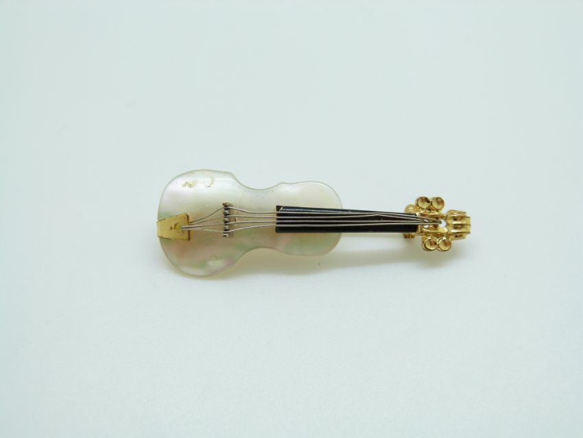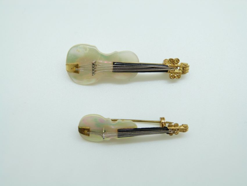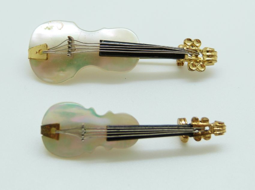 Two brooches in the form of violins set with mother of pearl, 5cm & 4cm