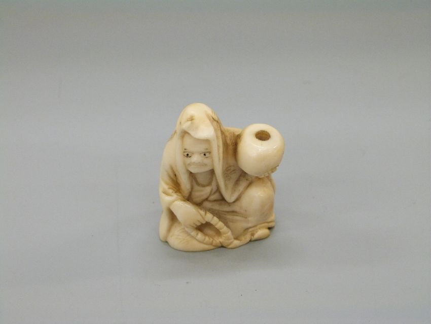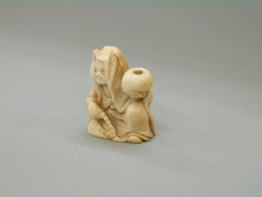 A Japanese Meiji period carved ivory netsuke of a man holding a bowl/gourd, 3.6cm
