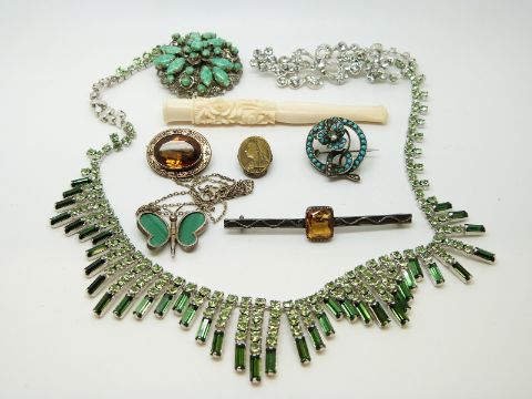 A Victorian brooch set with a large oval quartz, a Victorian brooch set with turquoise cabochons in the form of a flower, a white metal necklace set with malachite in the form of a butterfly, a silver brooch set with citrine etc