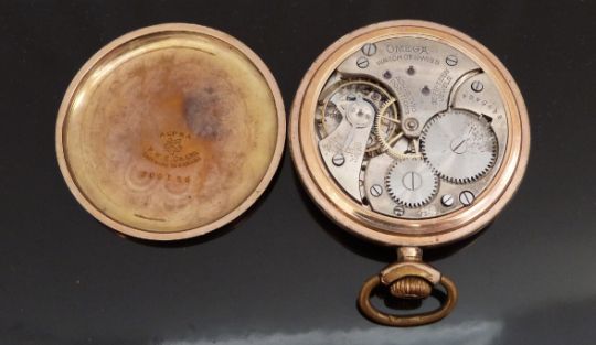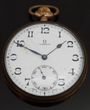 Omega gold plated keyless winding open faced gentleman's pocket watch with subsidiary seconds dial, blued hands and Arabic numerals, case diameter 49mm.