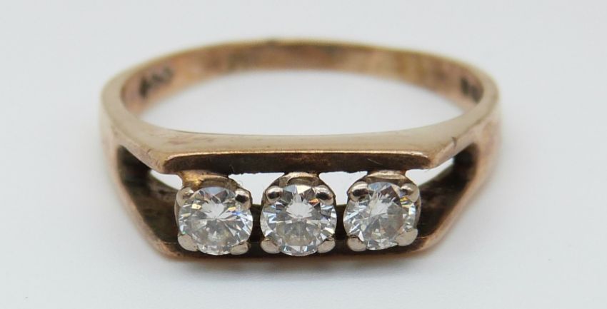 A 9ct gold ring set with three diamonds, total 0.45ct (size Q)