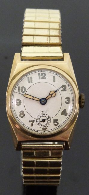 Uno 9ct gold gentleman's military style wristwatch with subsidiary seconds dial, luminous hands and Arabic numerals to cream face, on expanding metal bracelet, case diameter 25mm