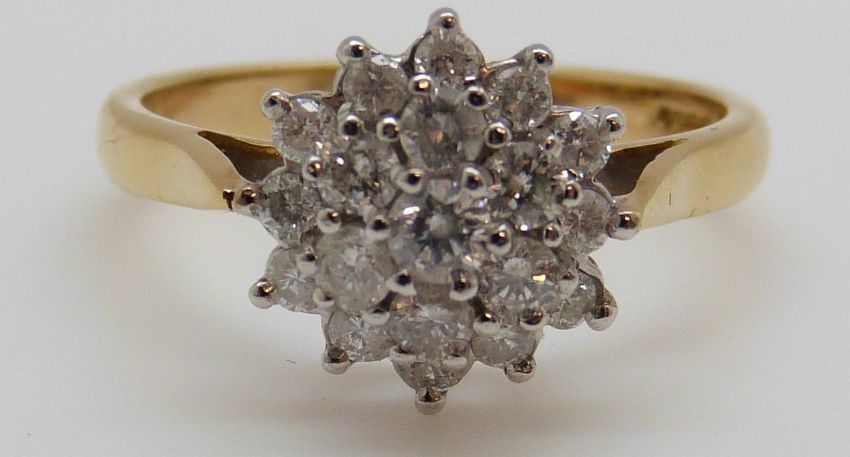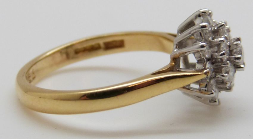 An 18ct gold ring set with diamonds in a cluster, total diamond weight approximately 0.75ct, 5g (size P)