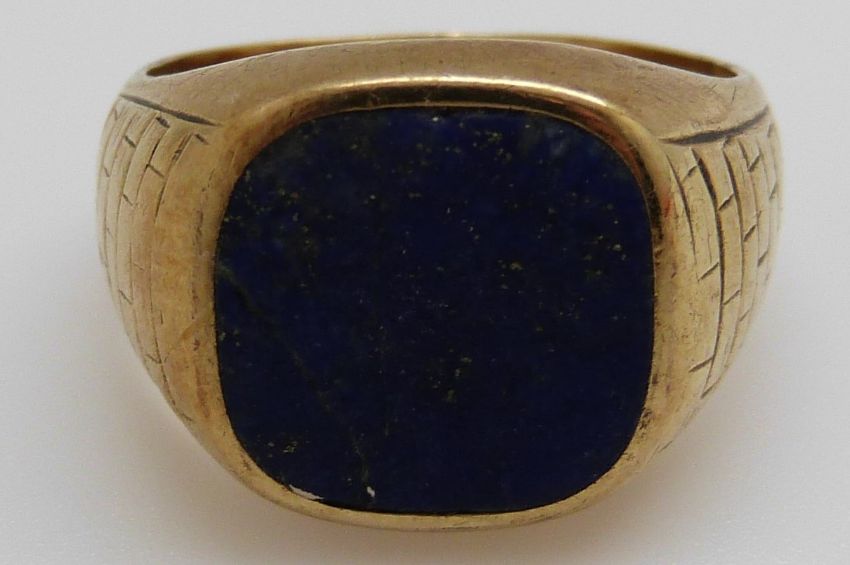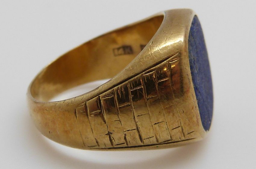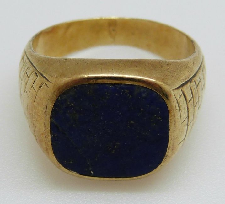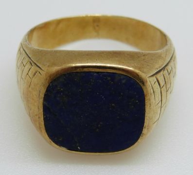 A 14k gold signet ring set with lapis lazuli, 7.6g (size L/M)