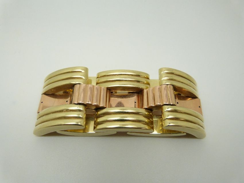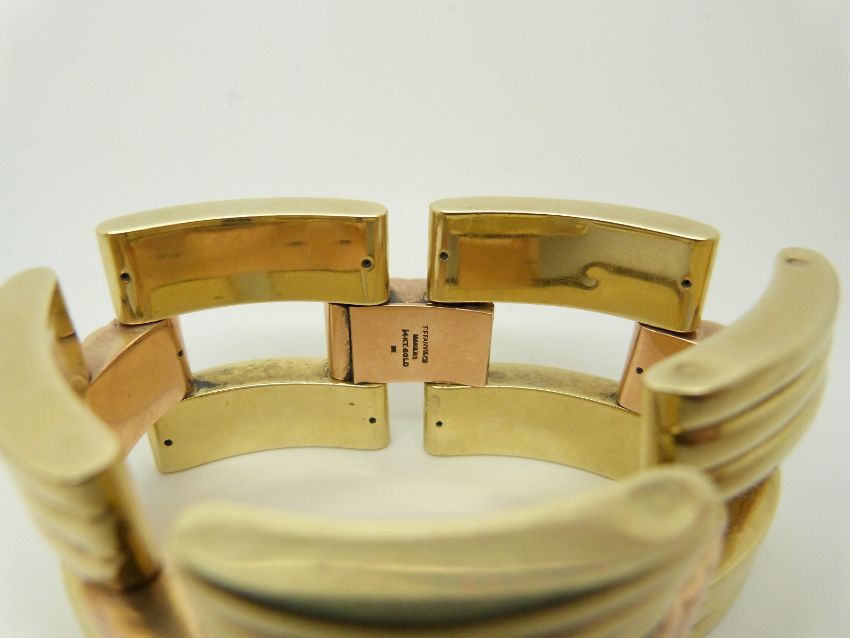 A Tiffany & Co bi-coloured 14k gold bracelet made up of rectangular ridged links, 85.3g, width 3.4cm