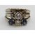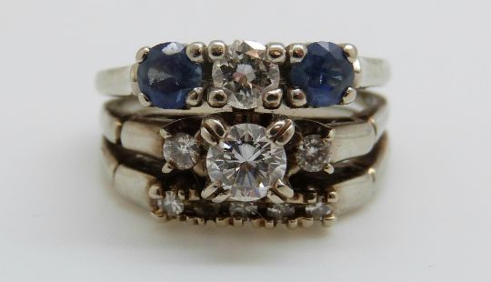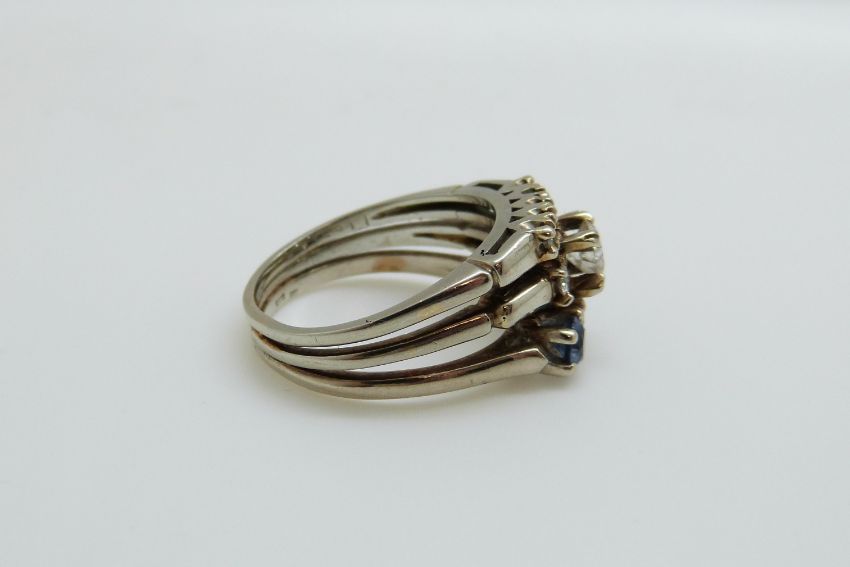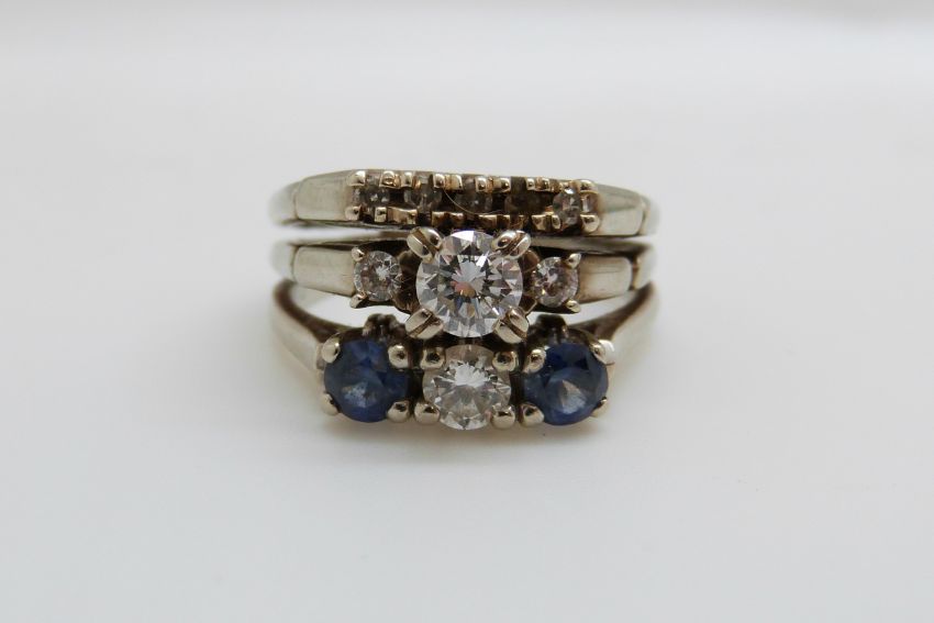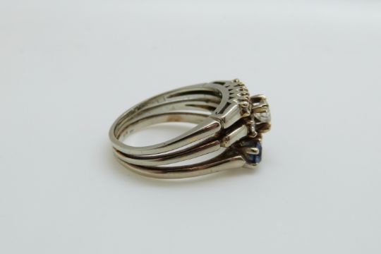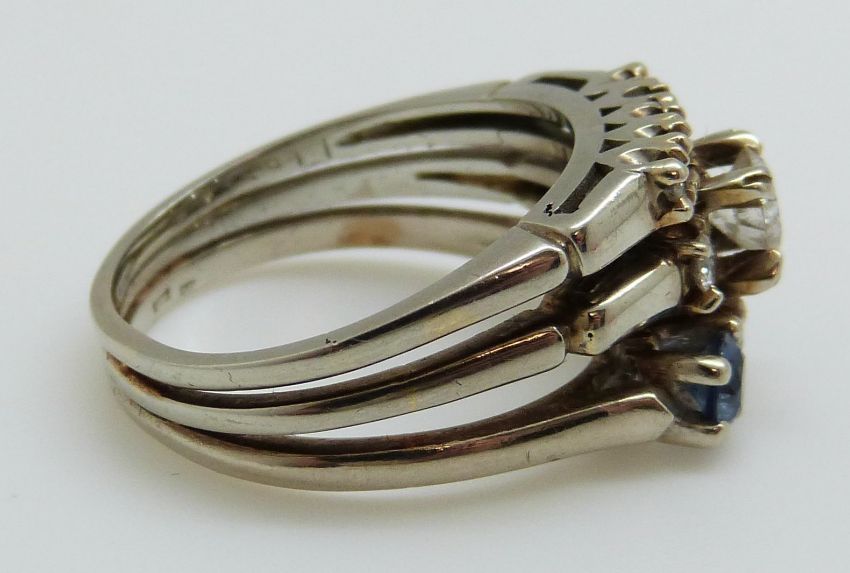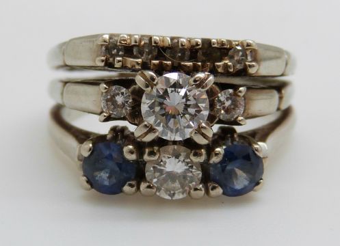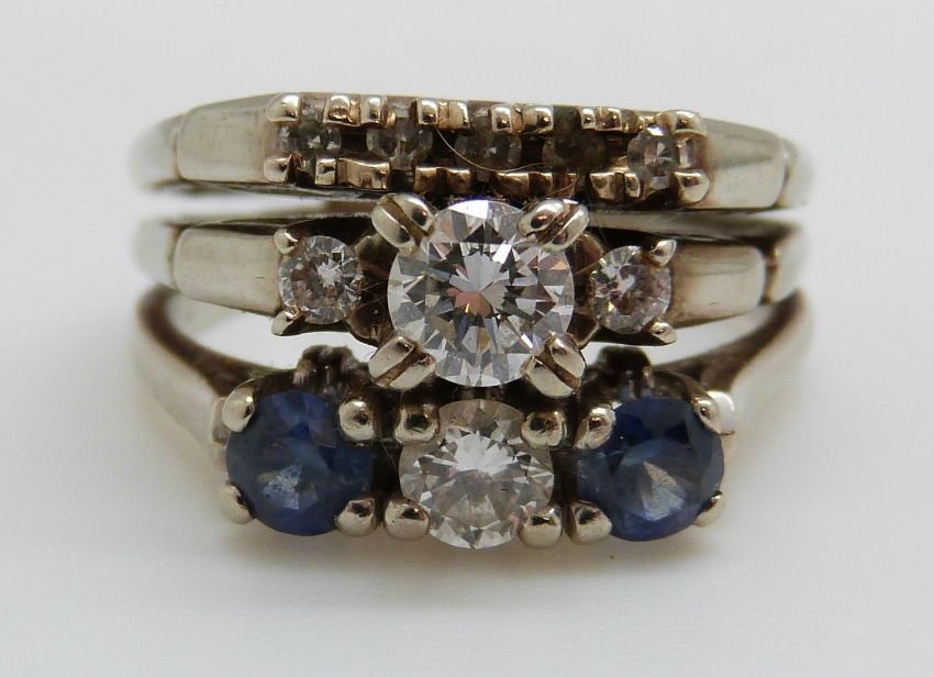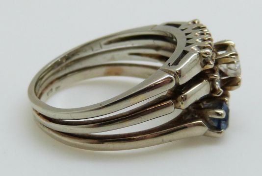 An 18ct white gold three band ring set with a round brilliant cut diamond of approximately 0.3ct,another diamond of approximately 0.2ct, two sapphires and further smaller diamonds (size P)