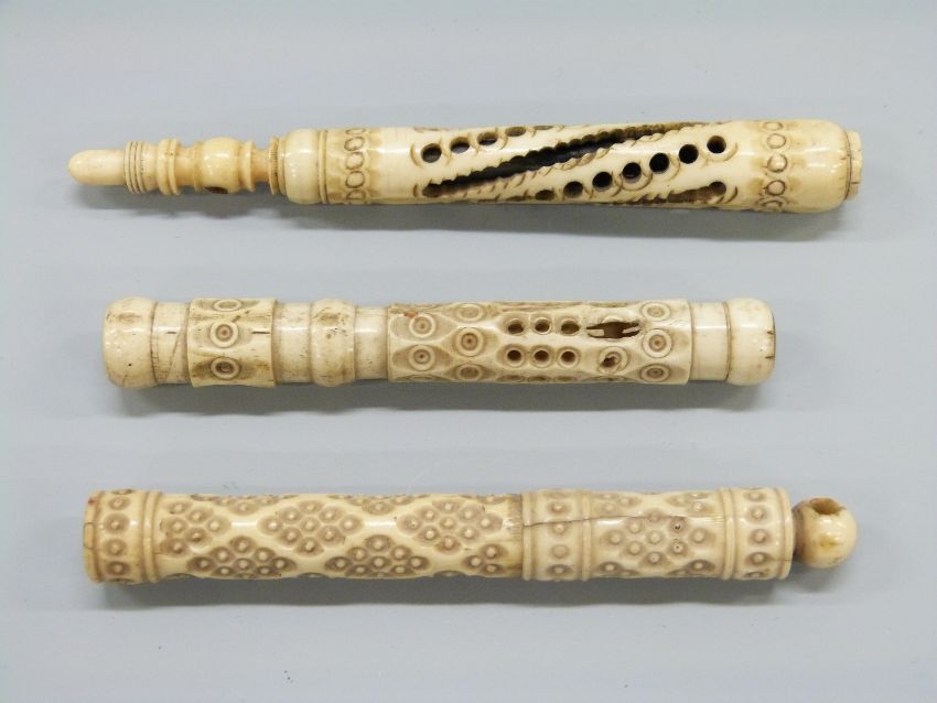 A Turkish folding knife, fruit knives, carved ivory and bone needle cases etc