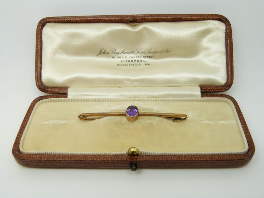 A 9ct gold brooch set with an amethyst, in original box