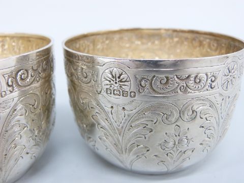A pair of Victorian hallmarked silver bowls or wine cups with acanthus leaf decoration, Sheffield 1861, maker Jay, Richard Attenborough Co Ltd, diameter 8cm, 129g