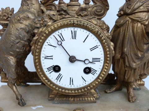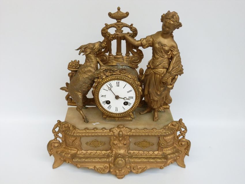 A 19thC ormolu cased marble cased mantel clock, the drum cased movement with goatherd girl and standing goat on either side, the enamel Roman dial with Breguet style hands, the two train movement by Vincente and Co., 12523 striking on a bell, 37cm tall