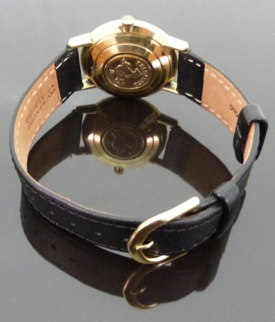 Omega Seamaster De Ville 9ct gold gentleman's automatic wristwatch with two tone hands and baton markers and silvered face, on black leather strap, case diameter 31mm