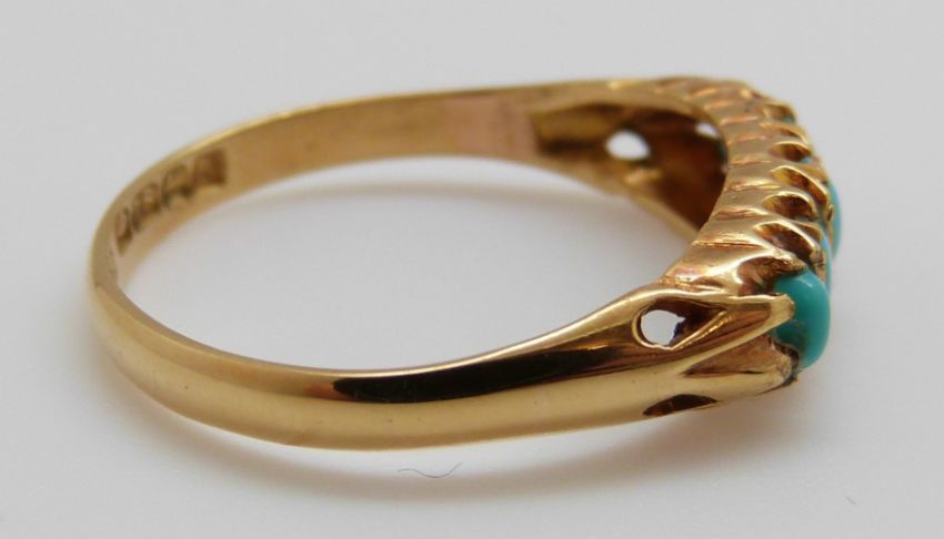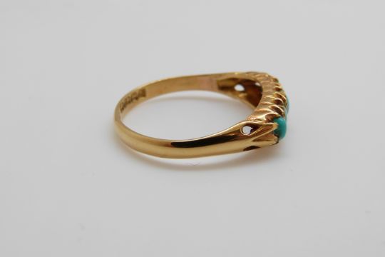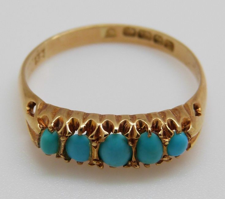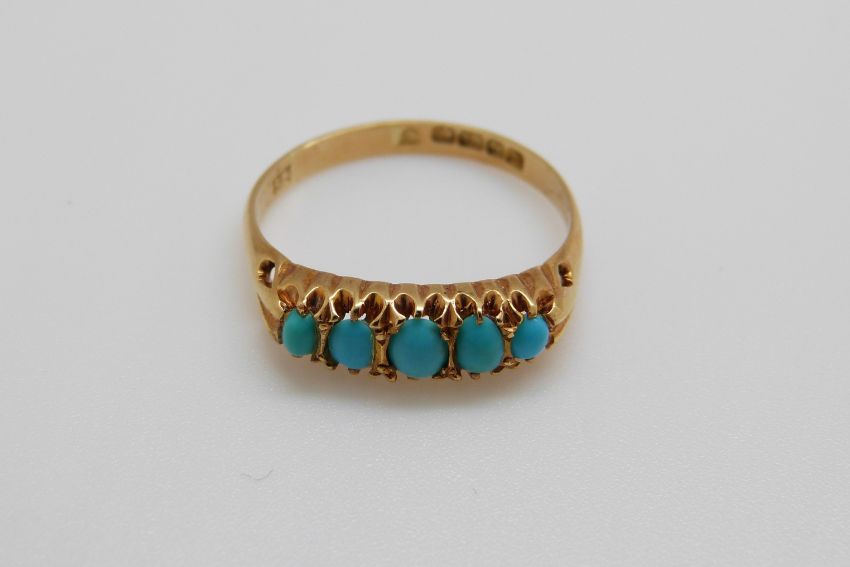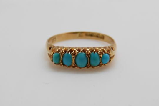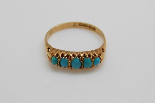 An 18ct gold ring set with five turquoise cabochons in a Cheltenham box, Birmingham 1926 (size P)