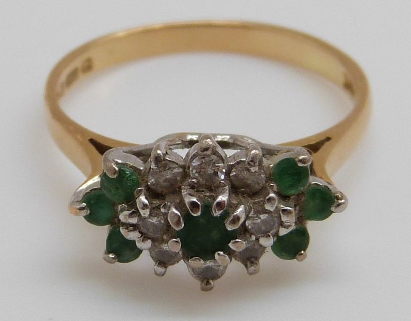 An 18ct gold ring set with emeralds and diamonds in a cluster (size K/L)