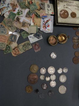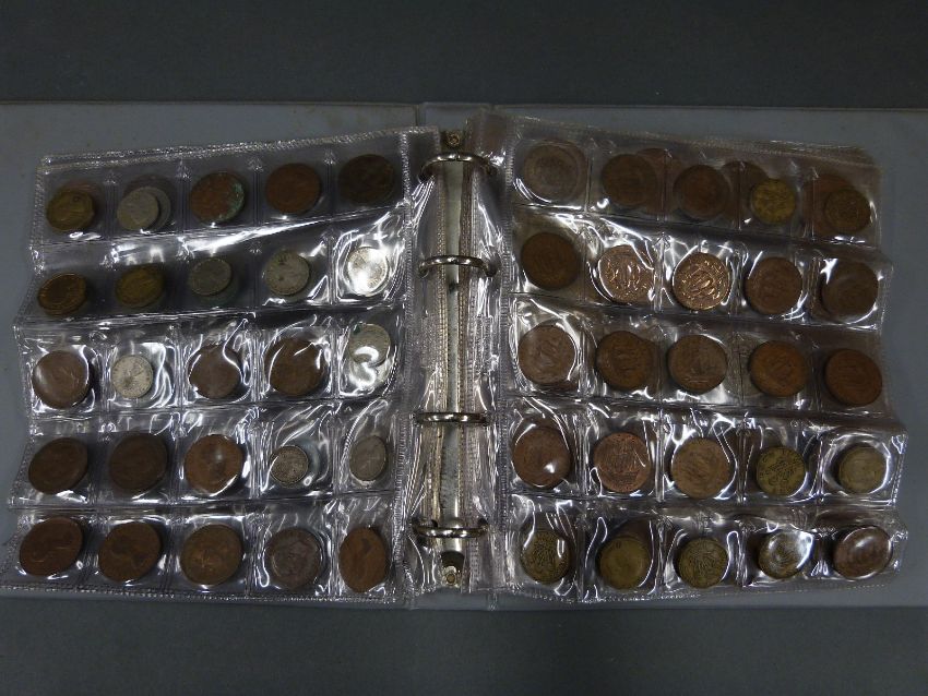 An amateur coin collection, includes UK and overseas, early decimal and small silver content with a George III sixpence bent as a love token in a brass sovereign case with gilt interior
