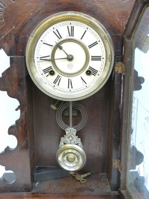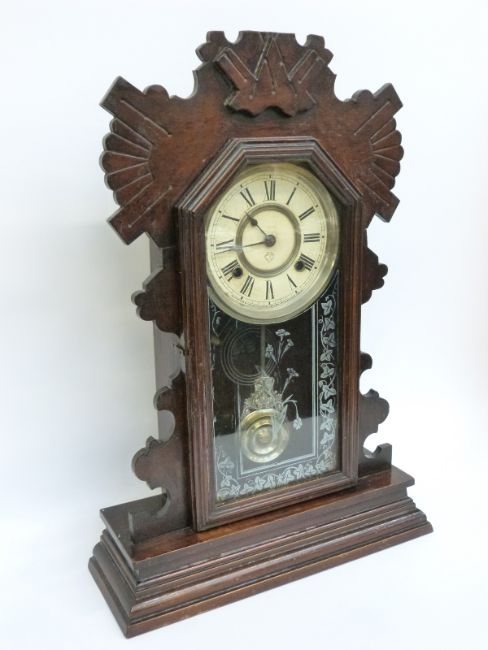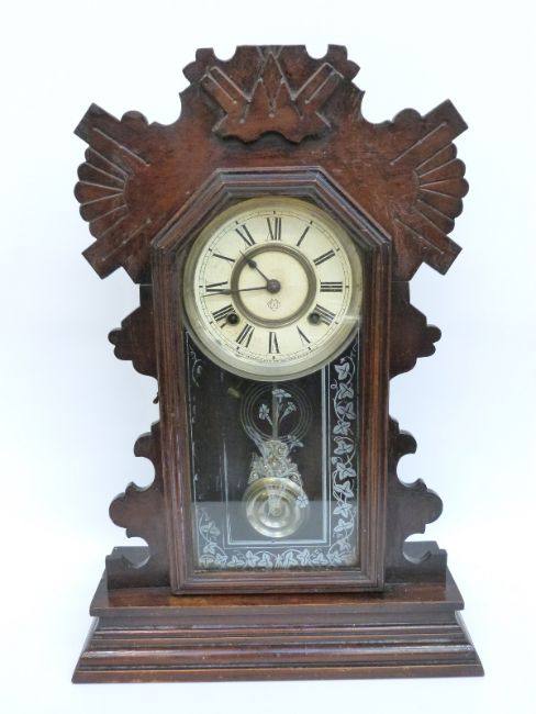 A late 19thC Ansonia Clock Co. New York, U.S.A two train "gingerbread" clock with silvered Roman dial and blued spade hands, the two train movement striking on a gong, 54cm tall