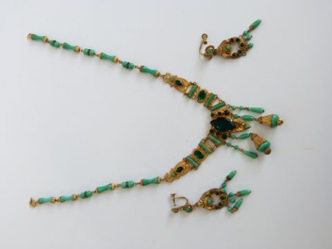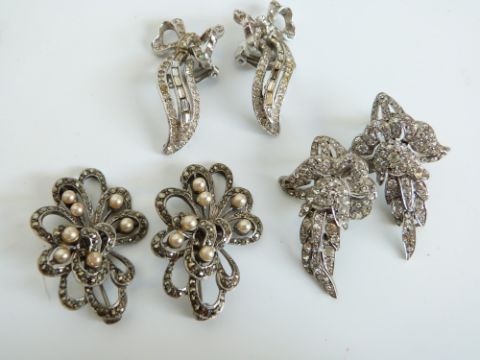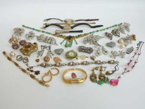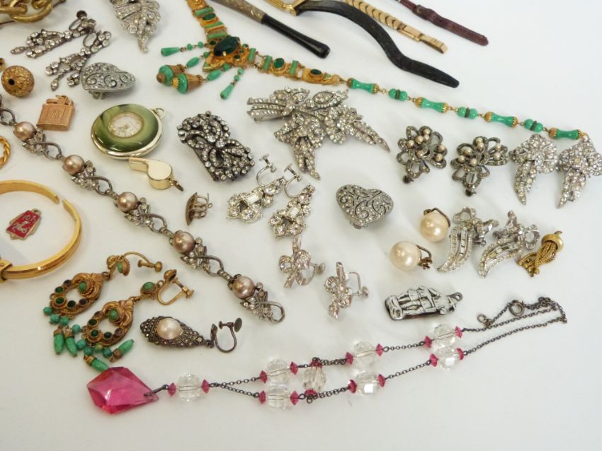 A collection of costume jewellery to include Victorian silver and paste metamorphic brooch with matching earrings, further articulated paste brooch with matching earrings, Victorian brooch, white metal mounted cheroot holder etc