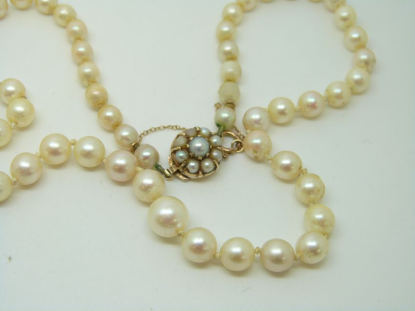 A pearl necklace with 14ct gold clasp set with pearls, and a pair of pearl earrings