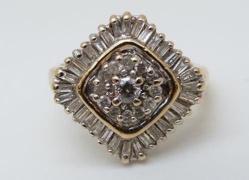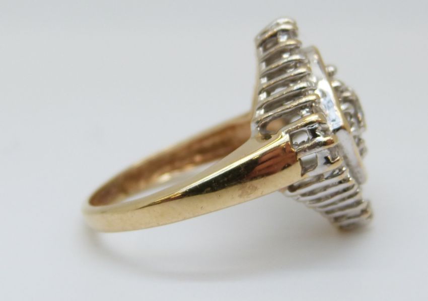 A 9ct gold ring set with round cut and baguette cut diamonds in a cluster, 4.28g (size M)