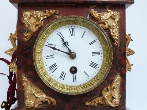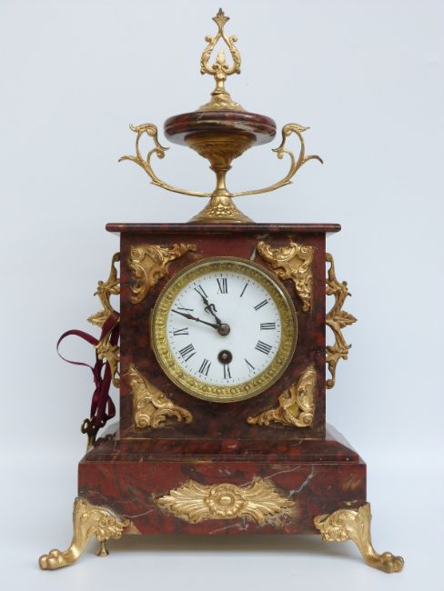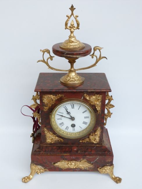 A burgundy marbled and ormolu clock, the Roman dial with gilt bezel and beetle and poker hands, raised on paw feet, 42cm tall