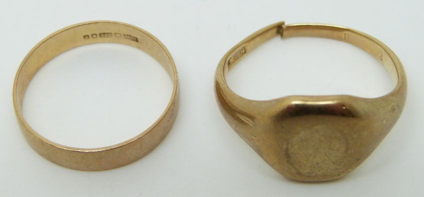 A 9ct gold signet ring and a 9ct gold wedding band (6.57g)