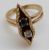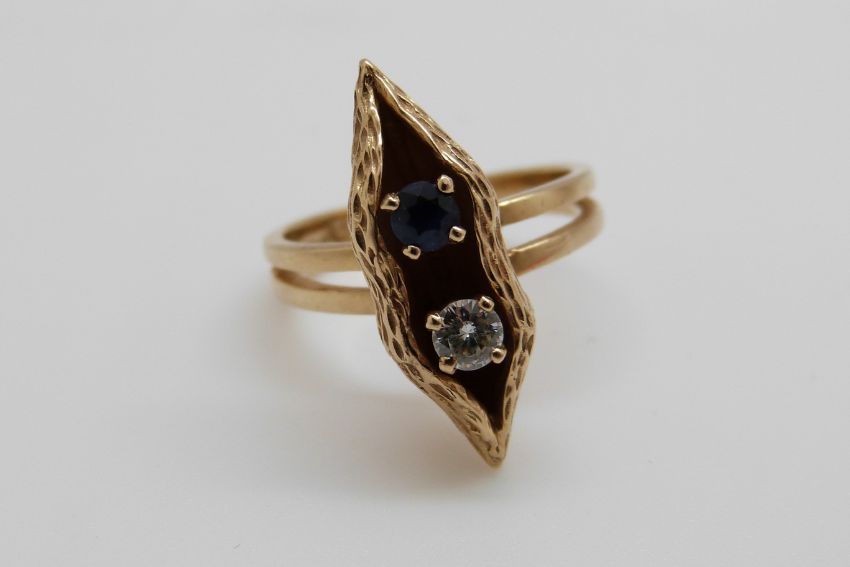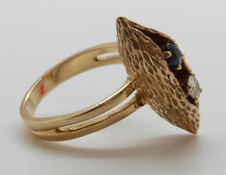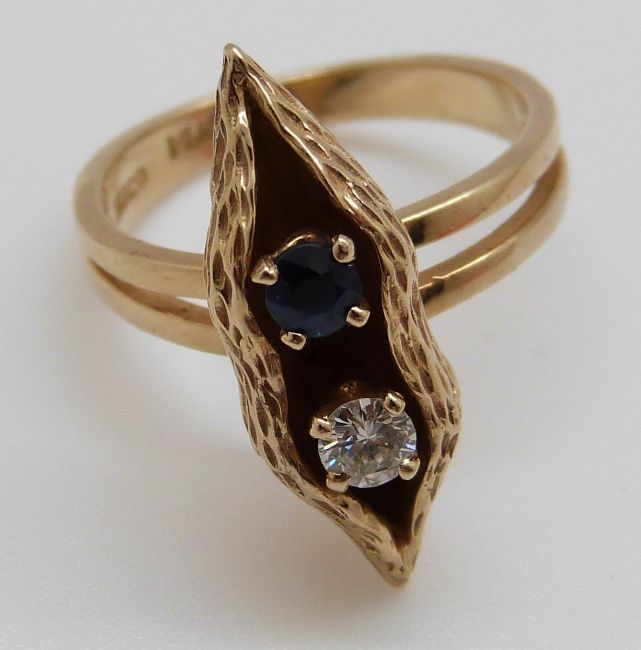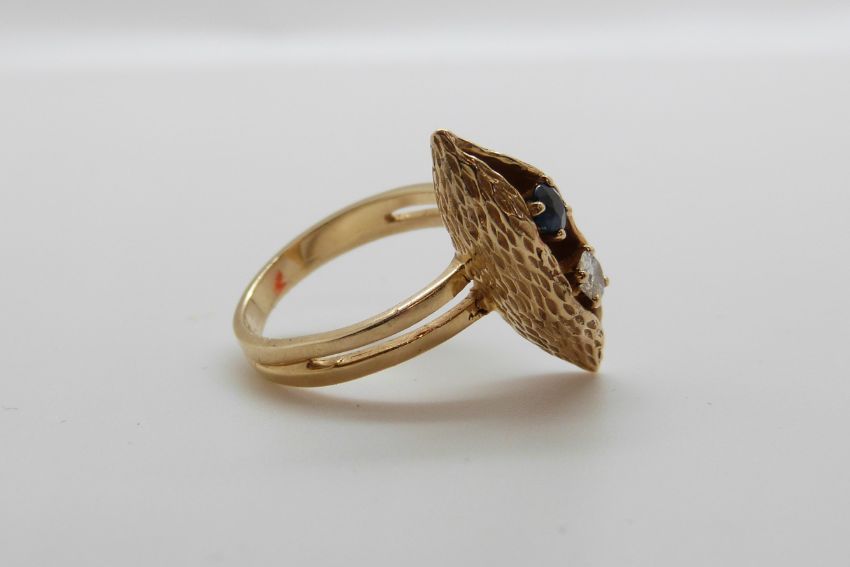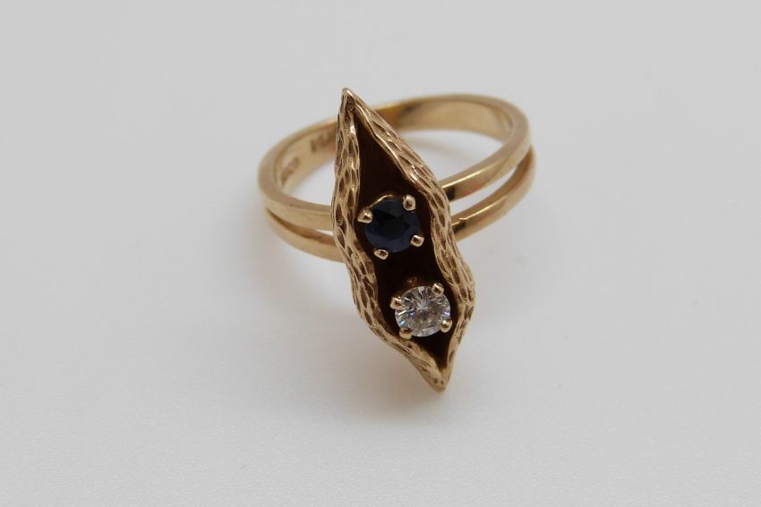 A 14k gold ring in the form of a pod set with a sapphire and diamond (size M)