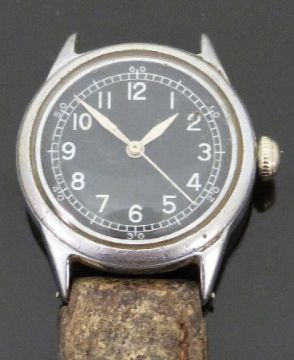 Bulova A11 gentleman's stainless steel military wristwatch with white hands and Arabic numerals and black face, case diameter 32mm.