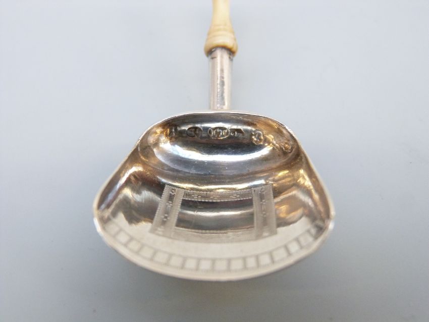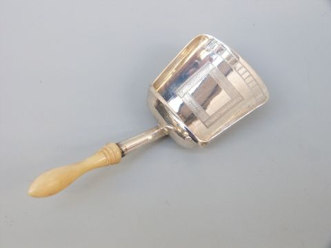 A Georgian hallmarked silver tea caddy spoon of scoop form with turned ivory handle Birmingham 1807, maker's mark IT, length 7.5cm