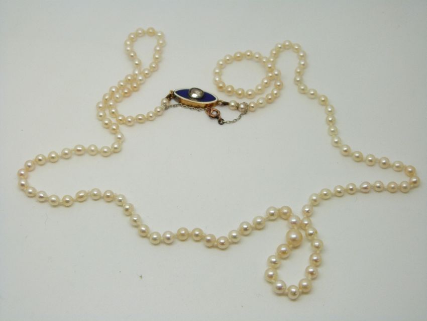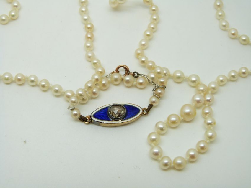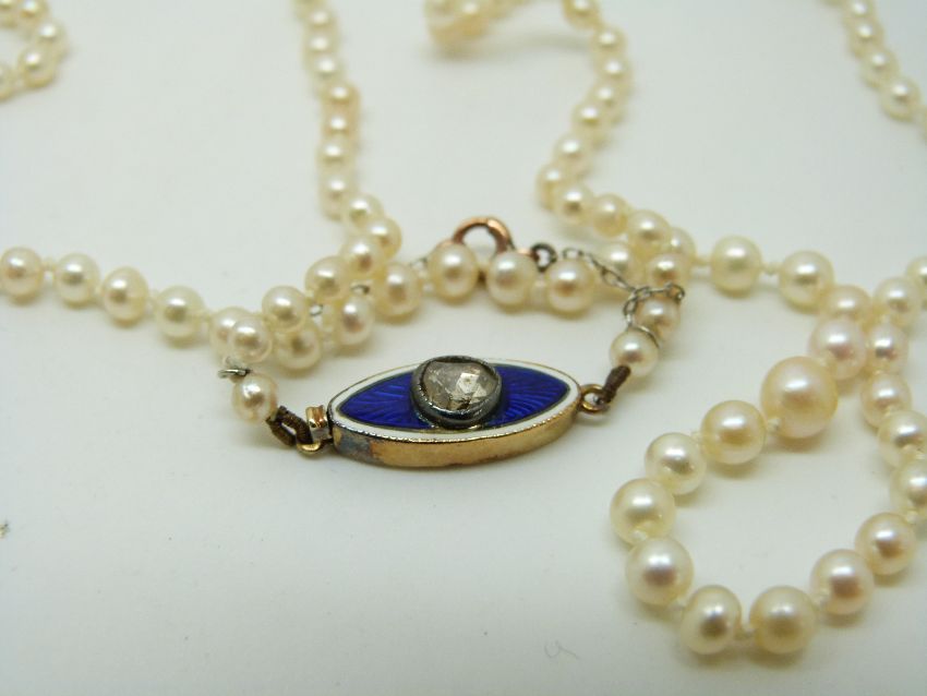 A Victorian graduated pearl necklace with blue guilloché enamel clasp set with a rose cut diamond