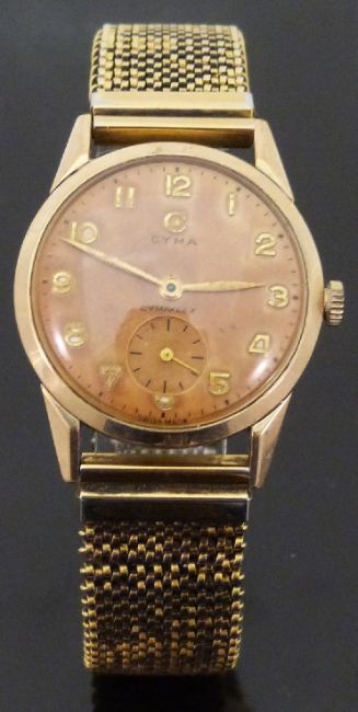Cyma Cymaflex gold plated gentleman's wristwatch with subsidiary seconds dial, gold hand and Arabic numerals and tan face, on expanding metal bracelet, case diameter 30mm