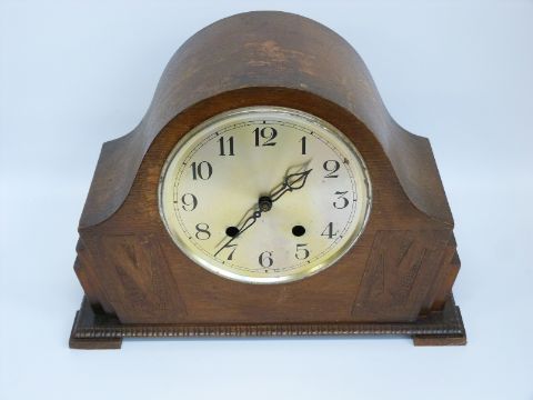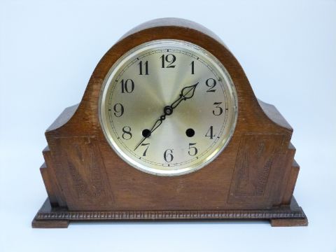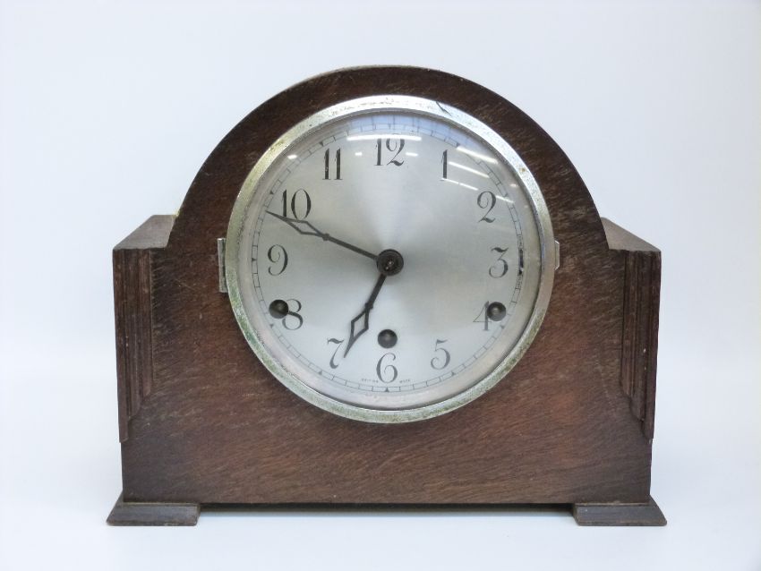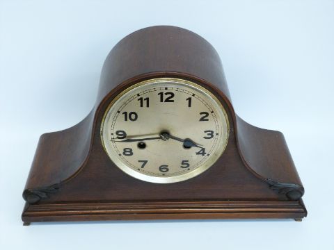 A 1930 'Napoleon hat' cased two train mantel clock with two train movement and Arabic dial, together with two other similar clocks, one with three train movement and a novelty wooden bottle top