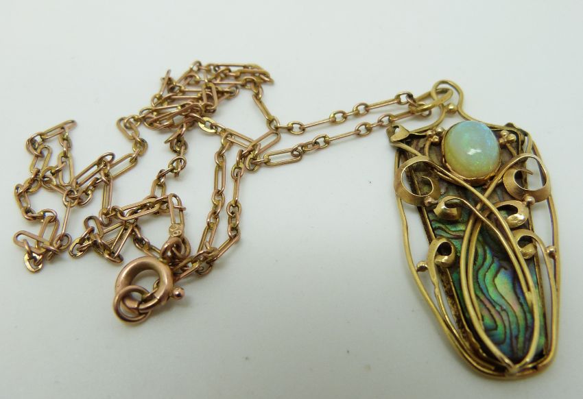 An Art Nouveau yellow metal necklace set with a piece of abalone to the ground and an opal cabochon in the style of Archibald Knox, 4.1cm