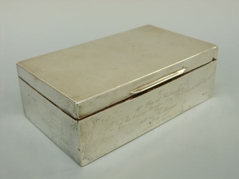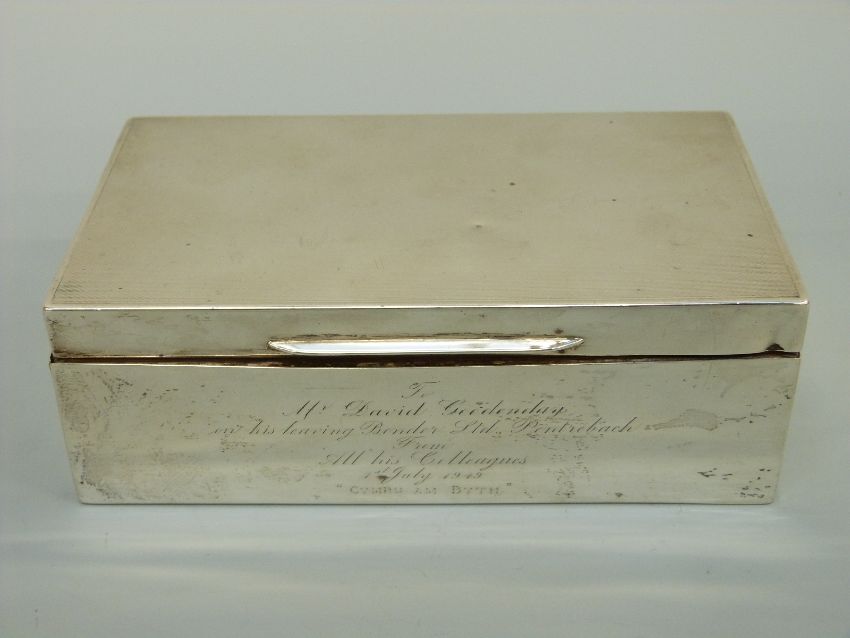 A hallmarked silver cigarette box with engine turned lid, marks rubbed, length 15.5cm