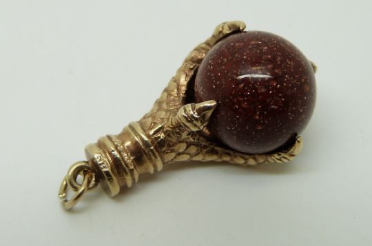 A 9ct gold charm/ pendant in the form of talons gripping a sunstone sphere, 7.7g
