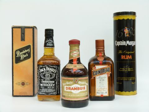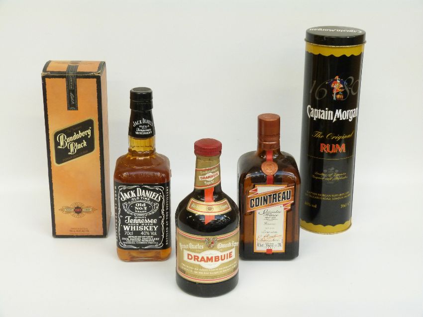 Five bottles of spirits comprising Cointreau 70cl 40% vol, Jack Daniel's 70cl 40% vol, Drambuie 50cl 40% vol, Captain Morgan 70cl 40% vol and Bundaberg Black rum 70cl 40% vol