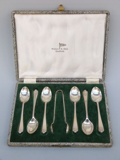A cased set of six Walker & Hall hallmarked silver teaspoons and tongs, Sheffield 1944, weight 113g